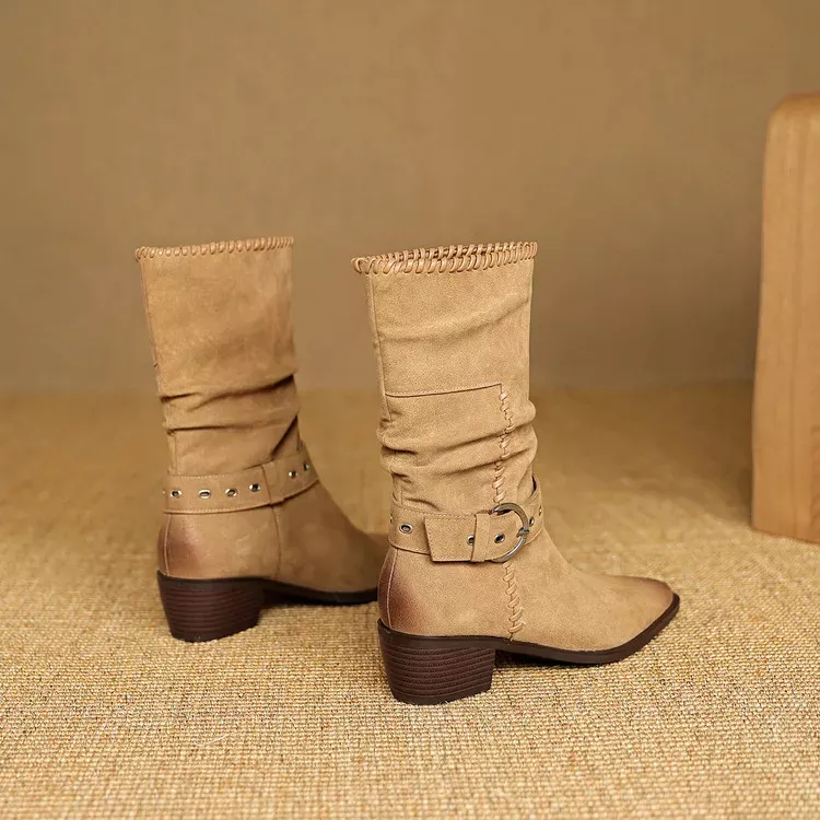 Women’s Mid-Calf Suede Boots – Handmade Square Toe Mid Heel